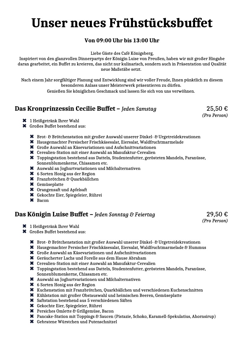 Genießen Sie jeden Samstag, Sonntag & Feiertag in einem stilvollen Ambiente unser Königin Luise Buffet oder unser Kronprinzessin Cecilie Buffet.
