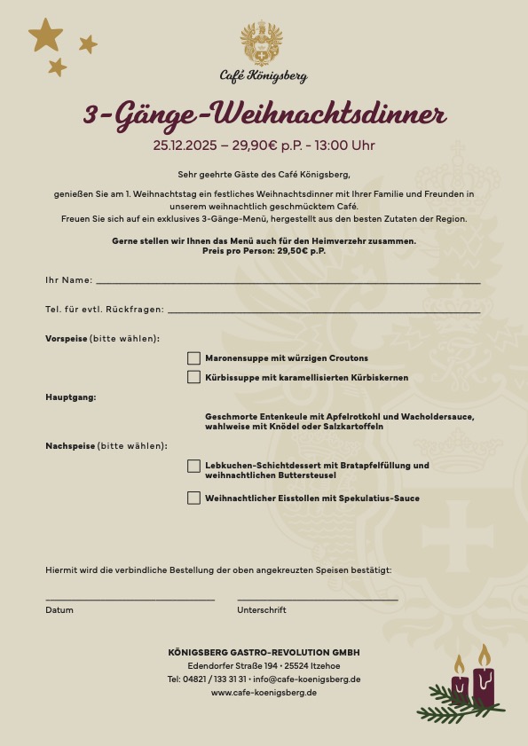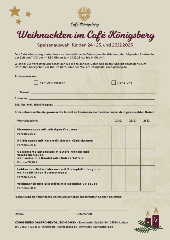 was erwartet die Besucherin bzw. den Besucher im Café Königsberg, einem Café also, das den alten Namen der ostpreußischen Haupt-, Krönungs- und Residenzstadt trägt und in Schleswig-Holstein neu erbaut wurde?
